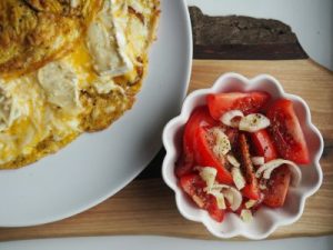 W międzyczasie pokroić pomidory i cebulkę, przyprawić solą i pieprzem. Polać oliwą.