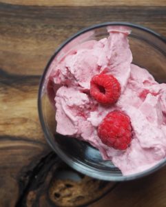 Maliny zamrozić. Wrzucić do pojemnika blendera, dolać śmietankę i słodzidło jeśli chcecie. Zblendować i zjadać od razu