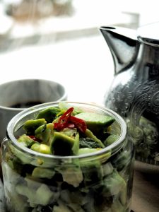 Awokado pokroić, dodać posiekaną cebulkę, chili i czosnek. Skropić sokiem z cytryny, doprawić, wymieszać