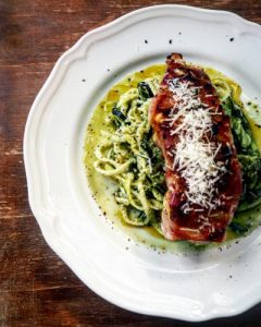 Kurczak w boczku na cukiniowym spaghetti z pesto