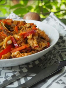 Kurczaka pokroić w cienkie płatki, zamarynować w paście curry (przez noc, kilka godzin, albo 15 minut ;))