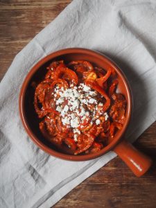 Loukaniko saganaki, czyli kiełbasa smażona po grecku z papryką, fetą i winem