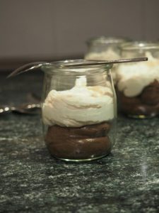 Ubić serek ze śmietanką, podzielić na dwie części. Do jednej dodać kakao i odżywkę a do drugiej erytrol i wiórki kokosowe. Krótko zmiksować i wyłożyć warstwami (najwygodniej przy pomocy rękawa cukierniczego)