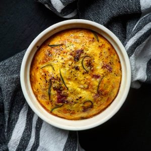 Drugim plastrem szynki wyłożyć ramekina ( lub inne niewielkie naczynko do zapiekania, moje ma 11cm średnicy i 5,5cm wysokości), wlać mieszaninę. Można posypać ziołami, świeżo mielonym pieprzem. Ja polałam jeszcze odrobiną oleju z chili.