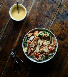 Dzieeeń dobry Mirko! Sałatka jaka jest każdy widzi (sałata rzymska, pierś z kurczaka, parmezan, boczek, pomidorki koktajlowe) ale sos jest świetny jeśli znudziły się wam winegrety.