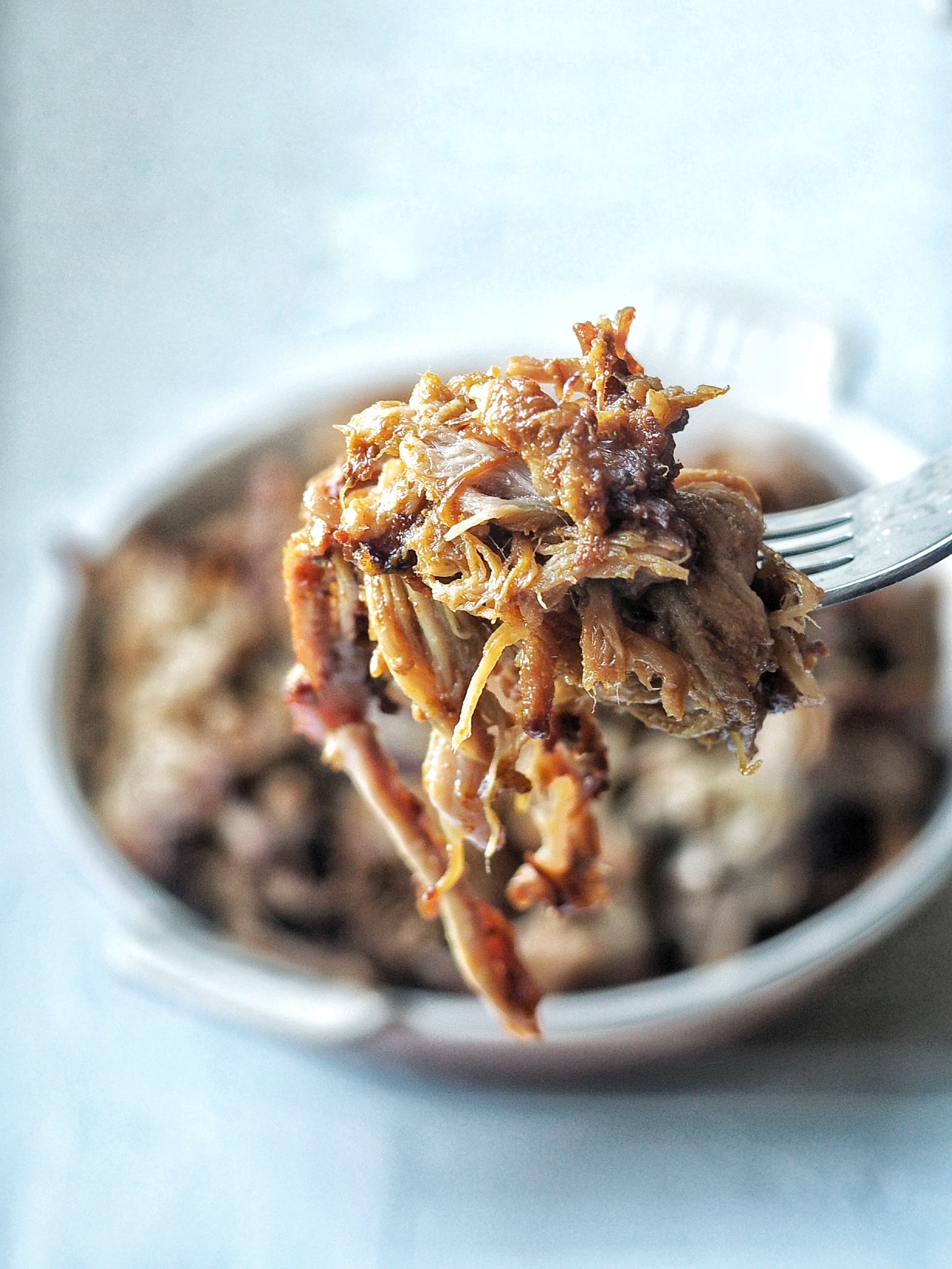Piec pod przykryciem lub gotować (ja używam multicookera) przez 4-5h w 100°C, aż mięso będzie się łatwo rozdzielać na włókna.