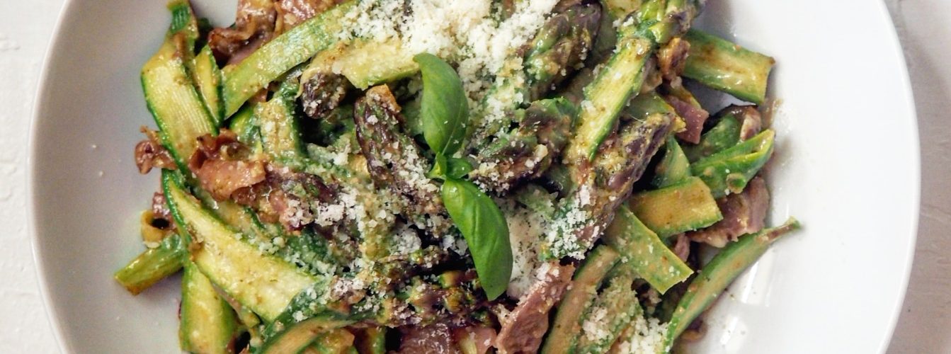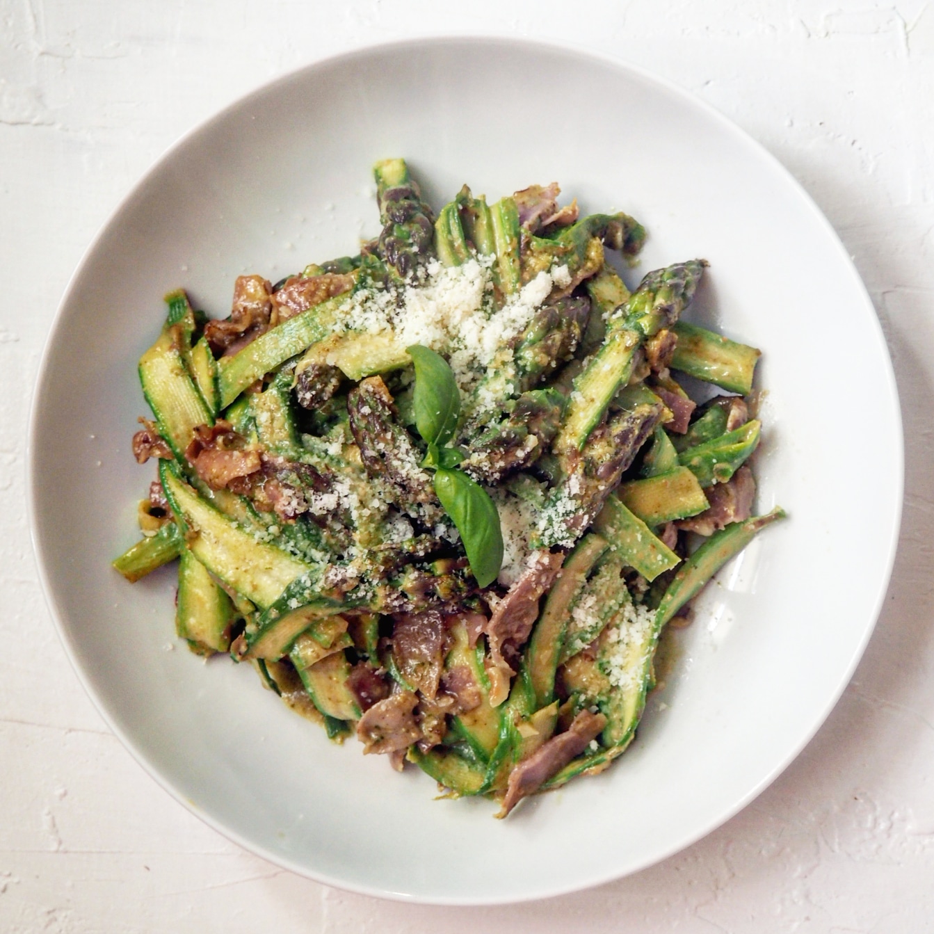 Dojrzewającą szynkę pokroić w paseczki, wysmażyć na złoto na suchej patelni. Dodać masło, posiekany czosnek, wstążki i główki szparagów. Smażyć kilka minut aż szparagi będą tak miękkie jak lubicie (ja smażę dosłownie minutkę, lubię chrupiące i prawie surowe). Dodać pesto, parmezan i śmietankę, wszystko wymieszać i smażyć jeszcze minutę na dużym ogniu.