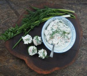 Posiekać łososia i wymieszać z resztą składników. Świetna na kanapki albo jak u mnie : podana w ogórkowych kubeczkach (ogórki pokrojone w 1-1,5cm plastry, ½ środka wydrążona malutką łyżeczką)